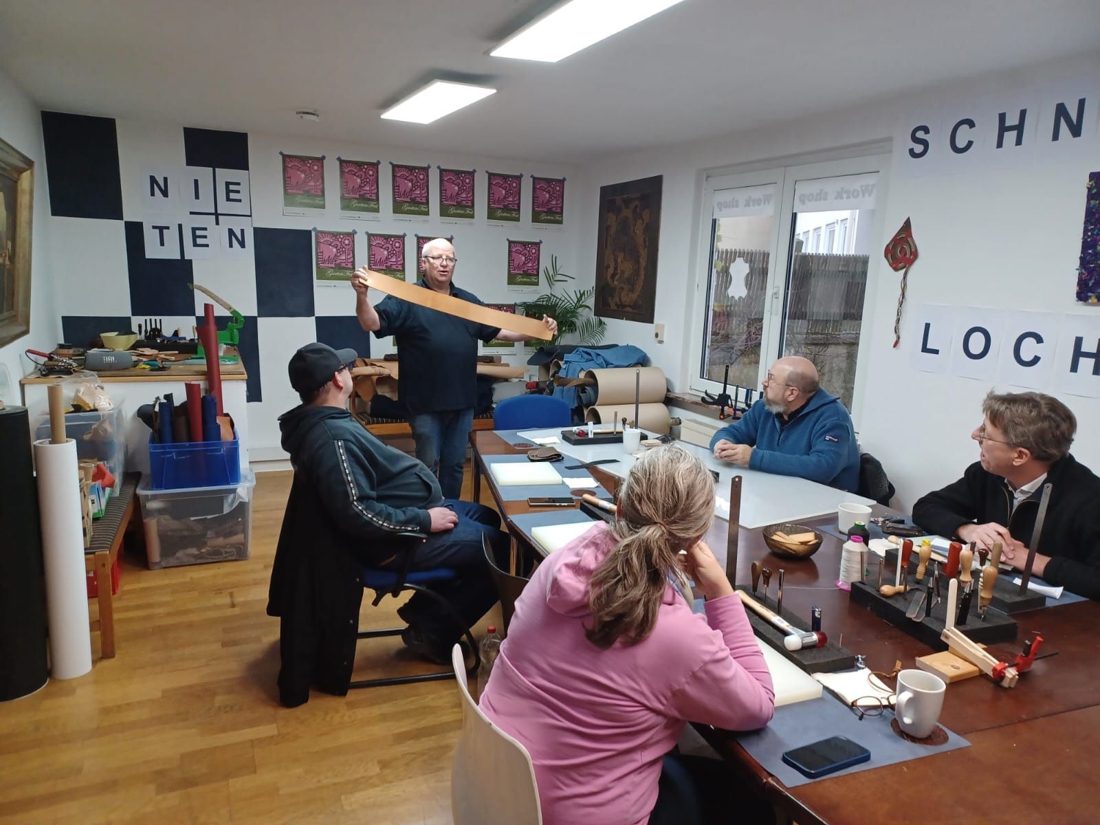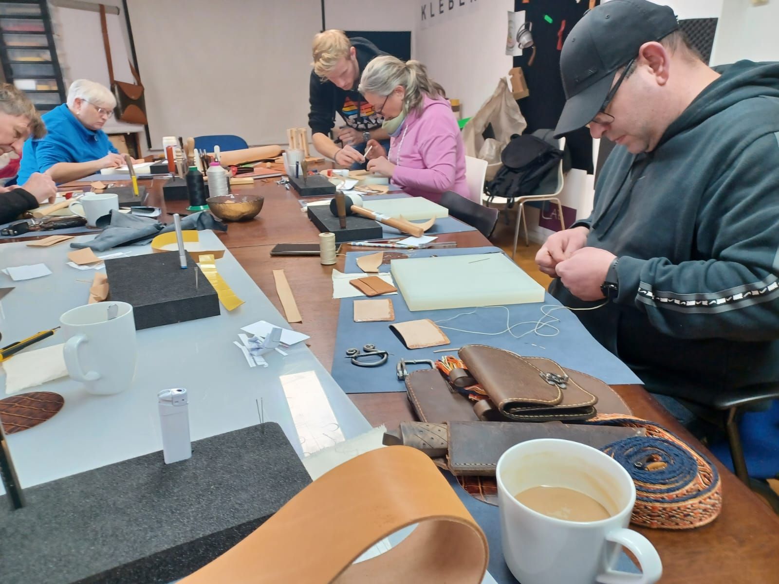 Am 14.12.2024 fand in den Räumen der Colonia - Leather GmbH der erste Kurs des Jahres 2024 statt. Nach einer kurzen Einführung in die Arbeit der Colonia - Leather GmbH durch Geschäftsführer Jean Thomas Keil, begannen die 5 Teilnehmer mit der Arbeit unter der Führung des Kurs - Leiters Aaron. Thema des Kurses war die eigenständige Herstellung eines Kartenetuis aus Leder für Visiten- und Kreditkarten. Vom Ausschneiden der Vorlagen, über das Verkleben der Einzelteile bis zum Vernähen des fertigen Produkts wurden die Teilnehmer fachmännisch durch den Workshop geführt und persönlich unterstützt. Nach etwa 4 Stunden konnte jeder Teilnehmer mit einem eigens hergestellten Kartenetuis nach Hause gehen.